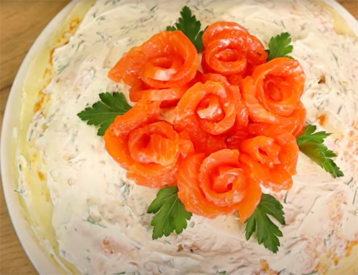 Розкішний, смачний, гарний торт із млинців із червоною рибою – правильне частування до свята Масляної.