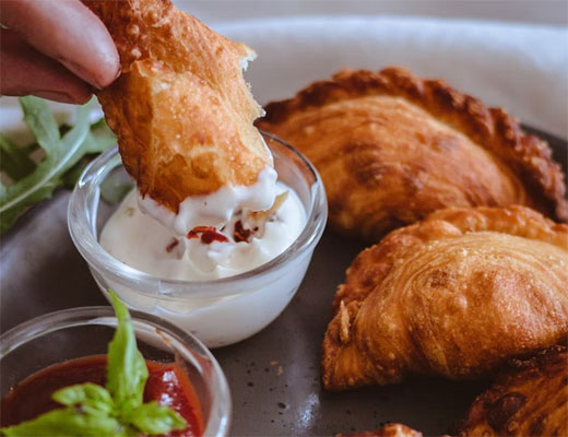 Найсмачніші відкриті пиріжки з житнього борошна у формі човників, як у хачапурі по-аджарськи з характерними складочками, що оточують начинку.