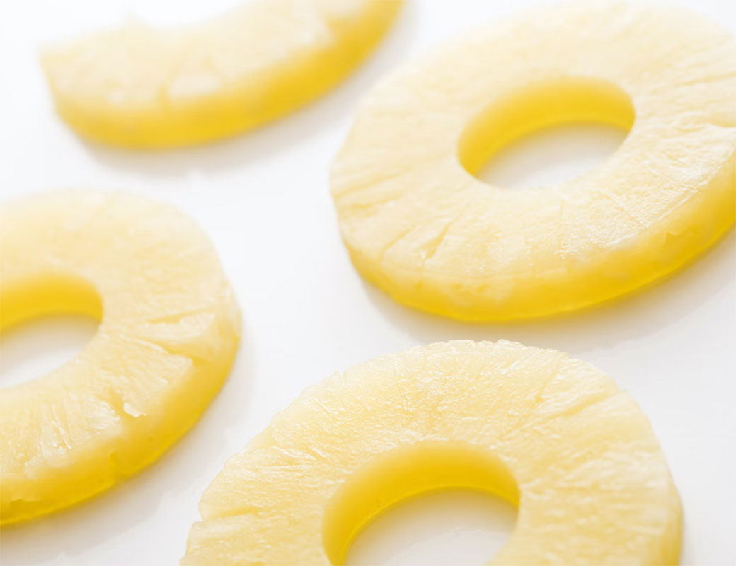 1. Візьміть 250 грам ананасів, наріжте їх кружальцями, зрізавши скоринку.